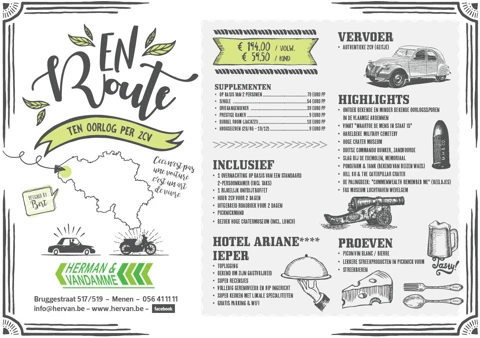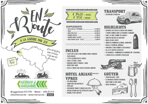 Ce voyage de deux jours ne se fait pas avec la propre voiture cette fois-ci mais avec une chèvre. Vous partez des Ardennes flamandes avec Ypres comme destination finale. Bien sûr, on ne roule pas en 1 ligne droite vers la ville sur l'Ijzer. Notre carnet de route détaillé vous emmène le long des cimetières et des sites de commémoration où vous pouvez découvrir et revivre les histoires de la Grande Guerre. Après une journée complète de croisière, vous arrivez à votre hôtel à Ypres, l'Hôtel Ariane. C'est la base idéale pour profiter de la ville le soir et bien sûr pour assister à la Dernière sonnerie qui est jouée tous les soirs sous la Porte de Menin.