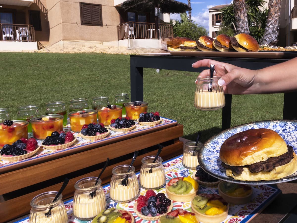 - Repas: petit déjeuner, déjeuner et dîner sous forme de buffet, bière, vin du patron, sangria, boissons rafraîchissantes, jus, eau et thé au déjeuner et dîner, 5x/semaine soirée à thème ( espagnol, américain, asiatique, hindou), 3 restaurants à la carte (Italien, Poke Bowl, sushi + salades, Foodtruck Tex Mex, 1 x chacun à réserver à l'arrivée) entre 10h-24h (sauf pendant les heures buffets): sandwiches, hotdogs, burgers et frites, entre 10h-24h dans les bars: vin du patron, sangria, bières locales et spiritueux, eau, thé, café, boissons rafraîchissantes et glaces