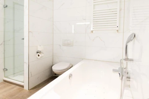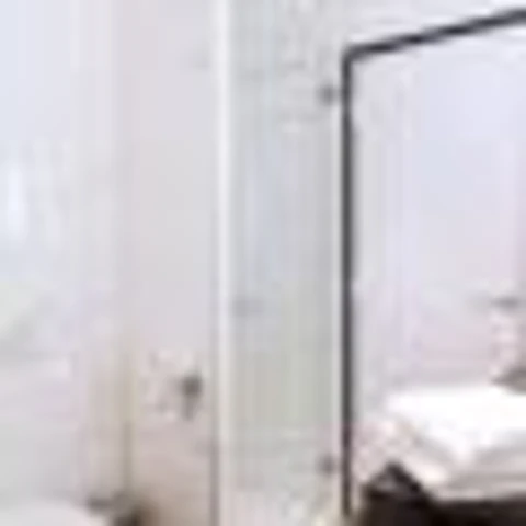 Chambre avec balcon. La salle de bain a une cabine de douche.