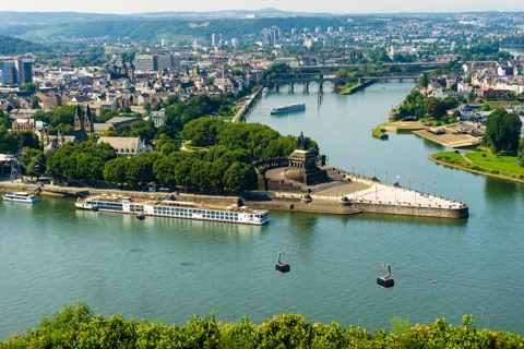 Après le petit-déjeuner, nous reprenons la mer en direction de Coblence. Cette charmante ville, située au confluent du Rhin et de la Moselle, invite à la promenade. Nous rejoignons ensuite la forteresse Ehrenbreitstein, d'où nous avons une vue imprenable sur la ville, le Rhin et la Moselle. Soirée libre à Coblence suivie d'un dîner à bord du bateau.